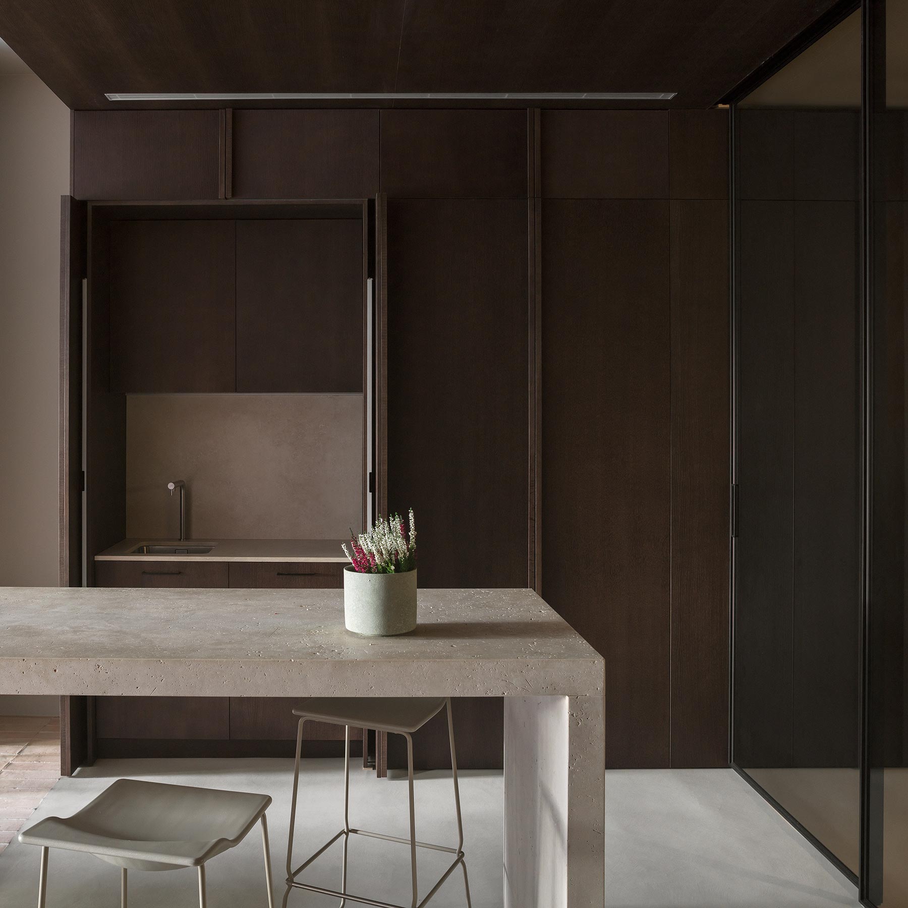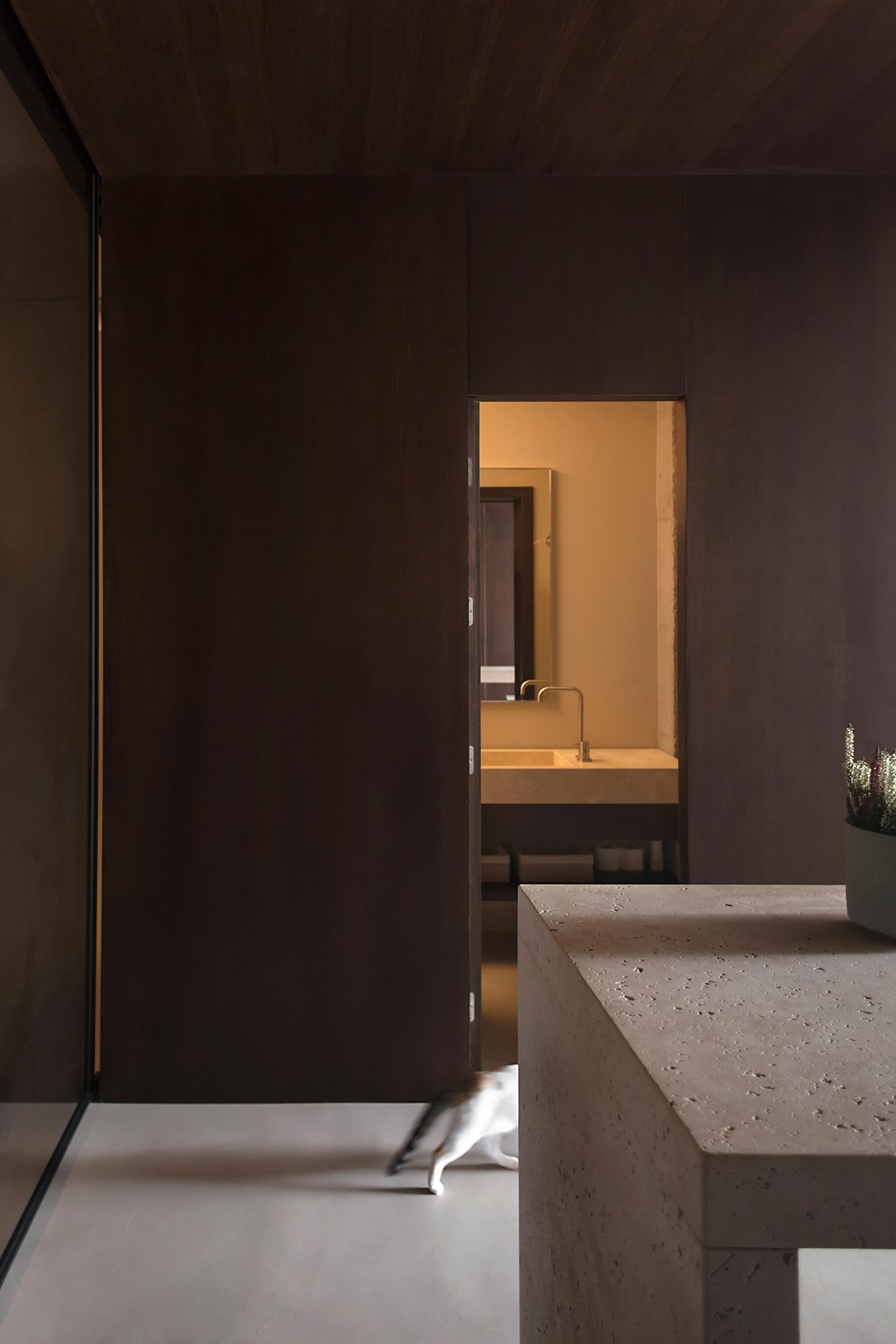 El único elemento que sobresale del lienzo creado por materiales continuos es la madera. El revestimiento de madera se relaciona con los espacios de servicio y almacenamiento. El diseño integral de la carpintería esta realizado por el estudio, por lo que se ha adaptado al máximo a las necesidades y estética