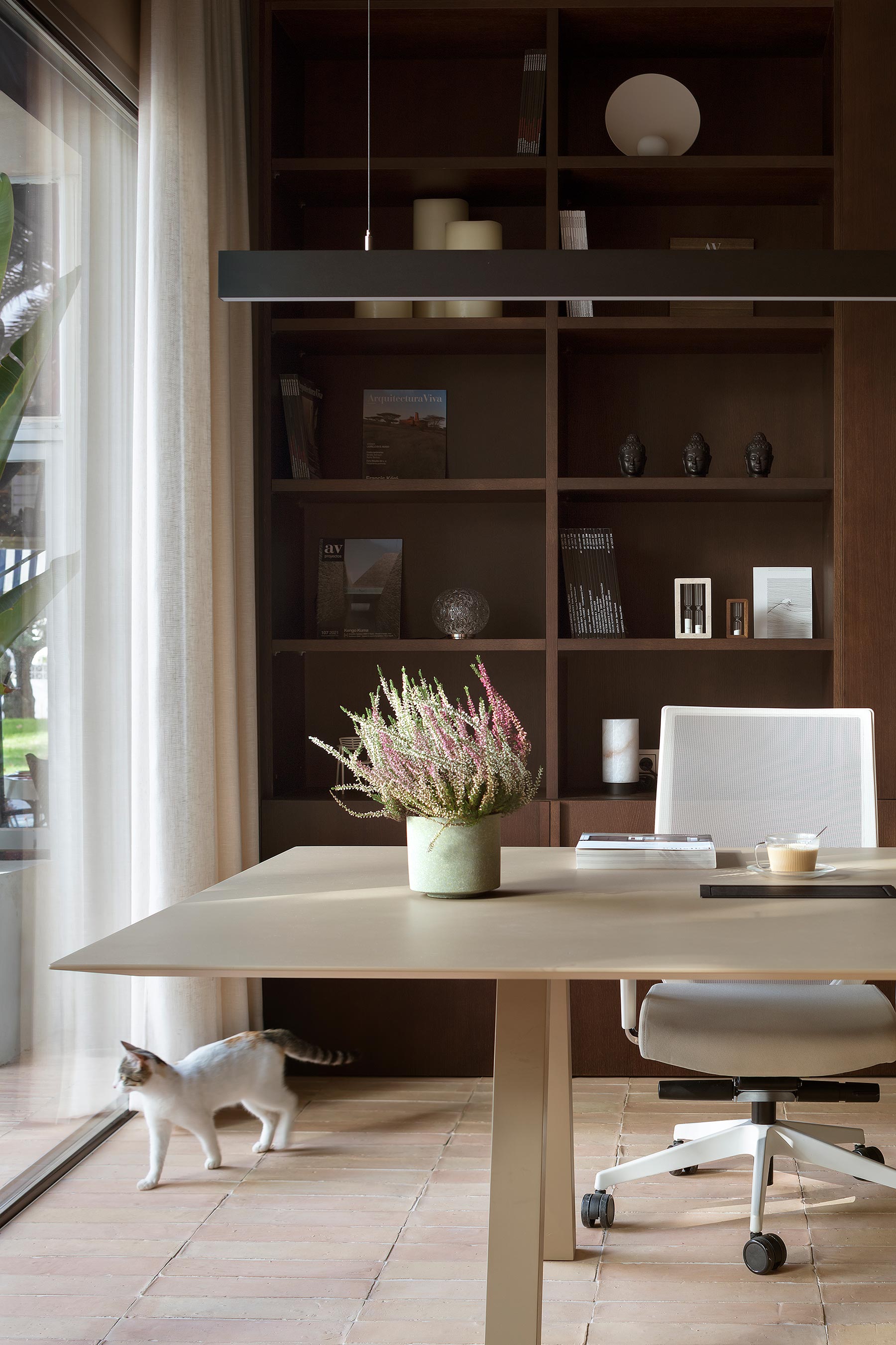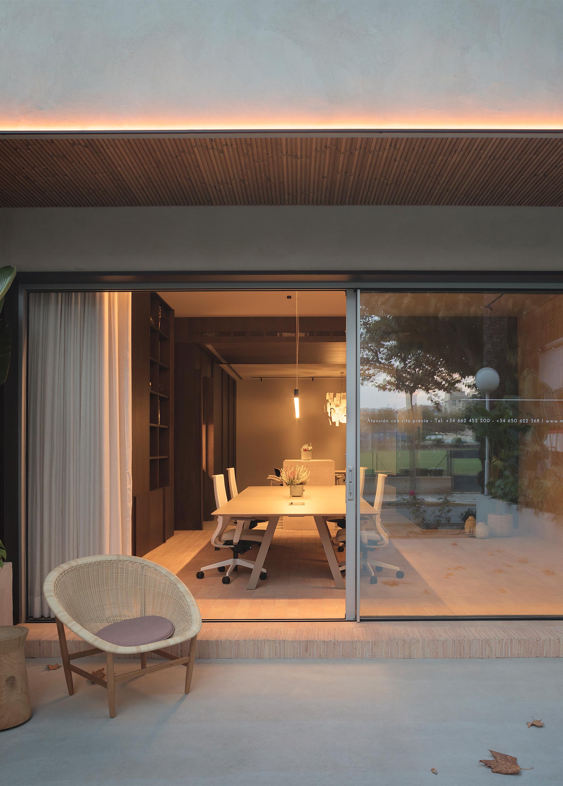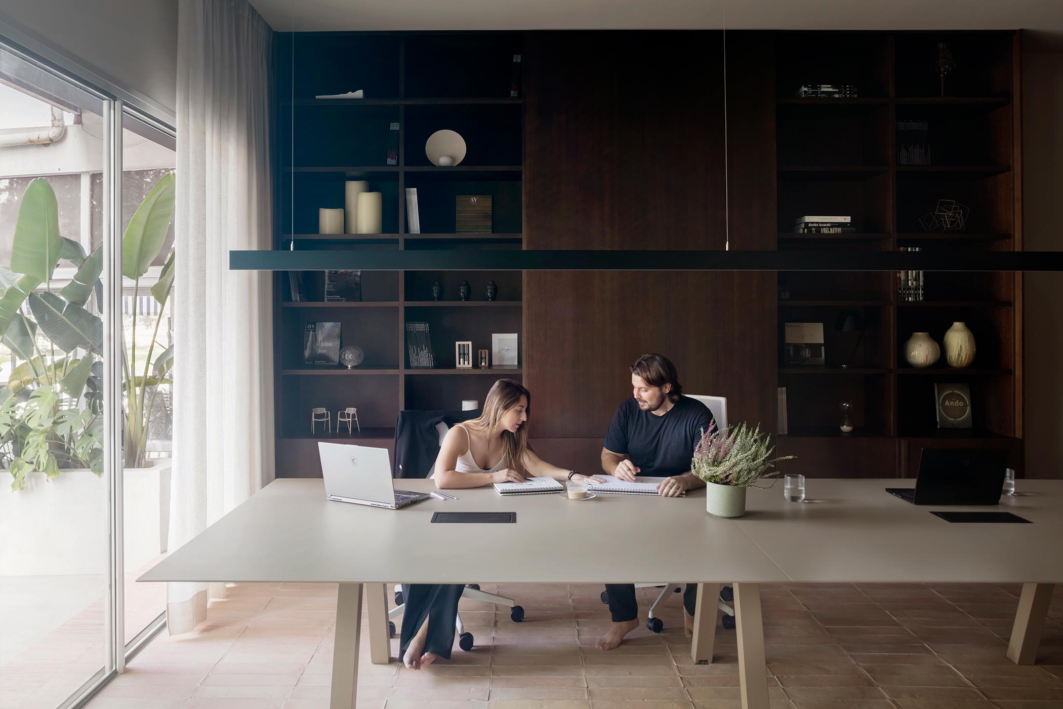 Existe una marcada transición entre el espacio de trabajo, con sus imperfecciones, y los espacios de office y sala de reuniones. Éstos se presentan como espacios abstractos en los que se unifica el acabado del pavimento, paredes y techos a través del uso de materiales continuos con la misma tonalidad en todos ellos.