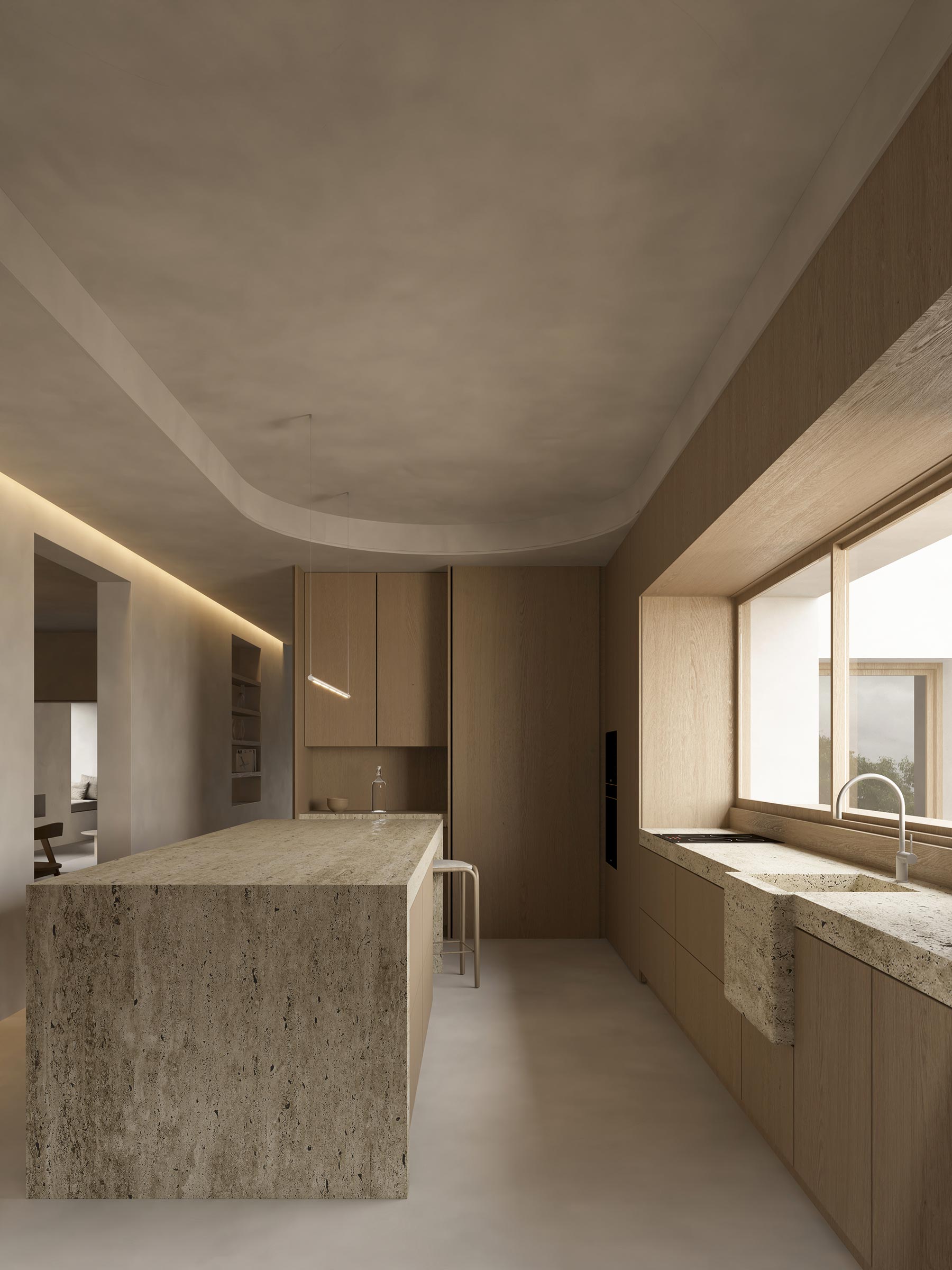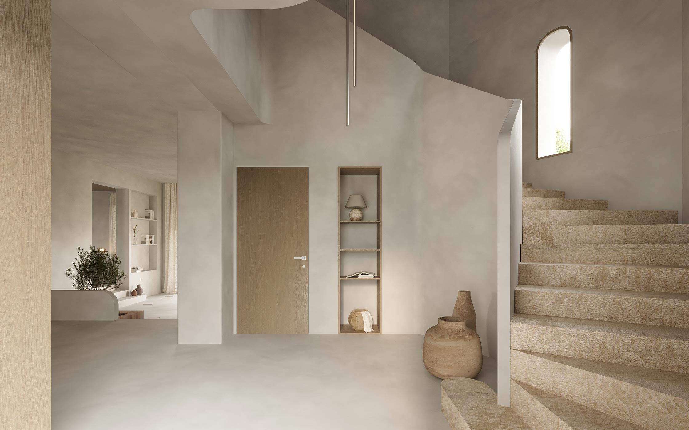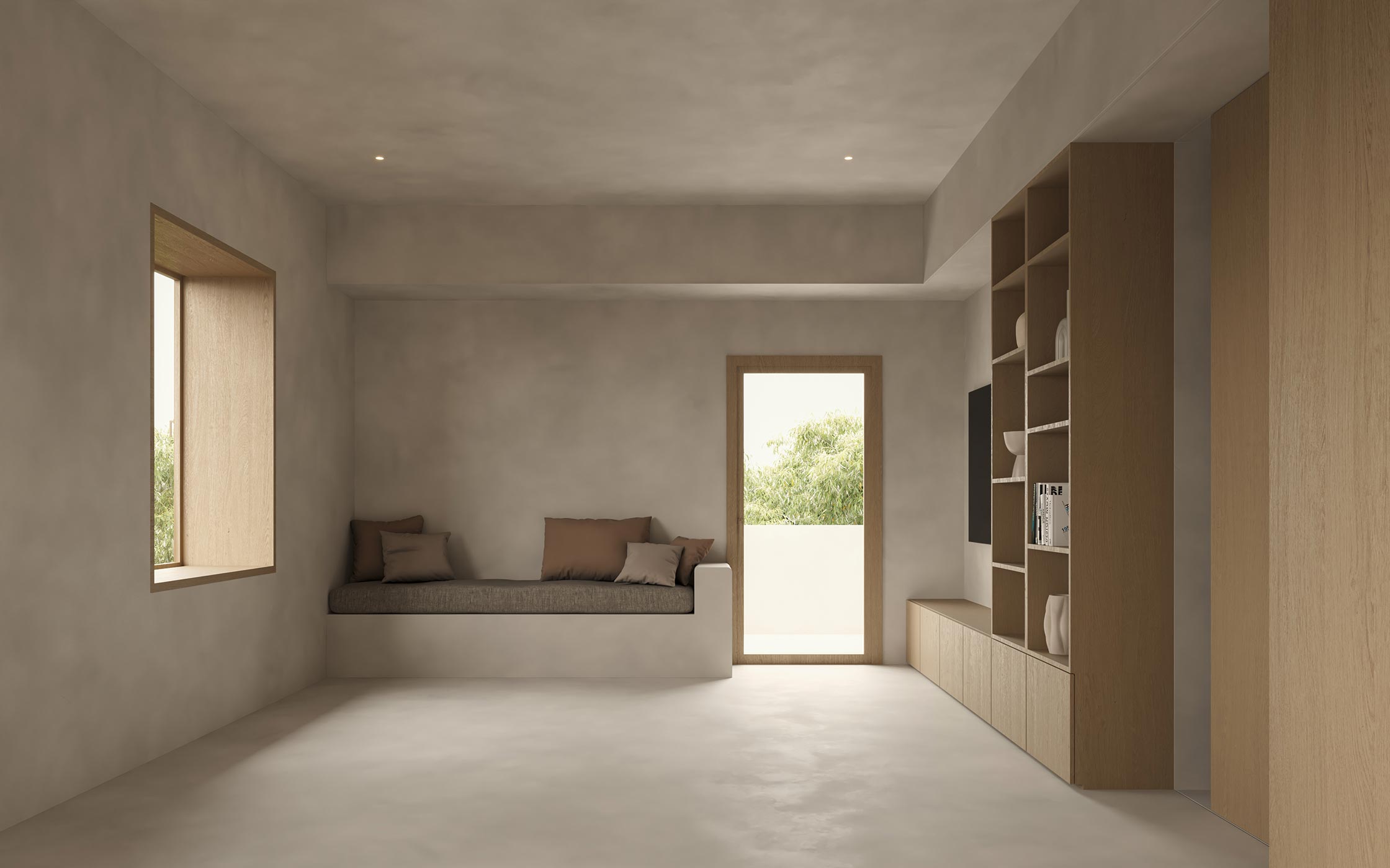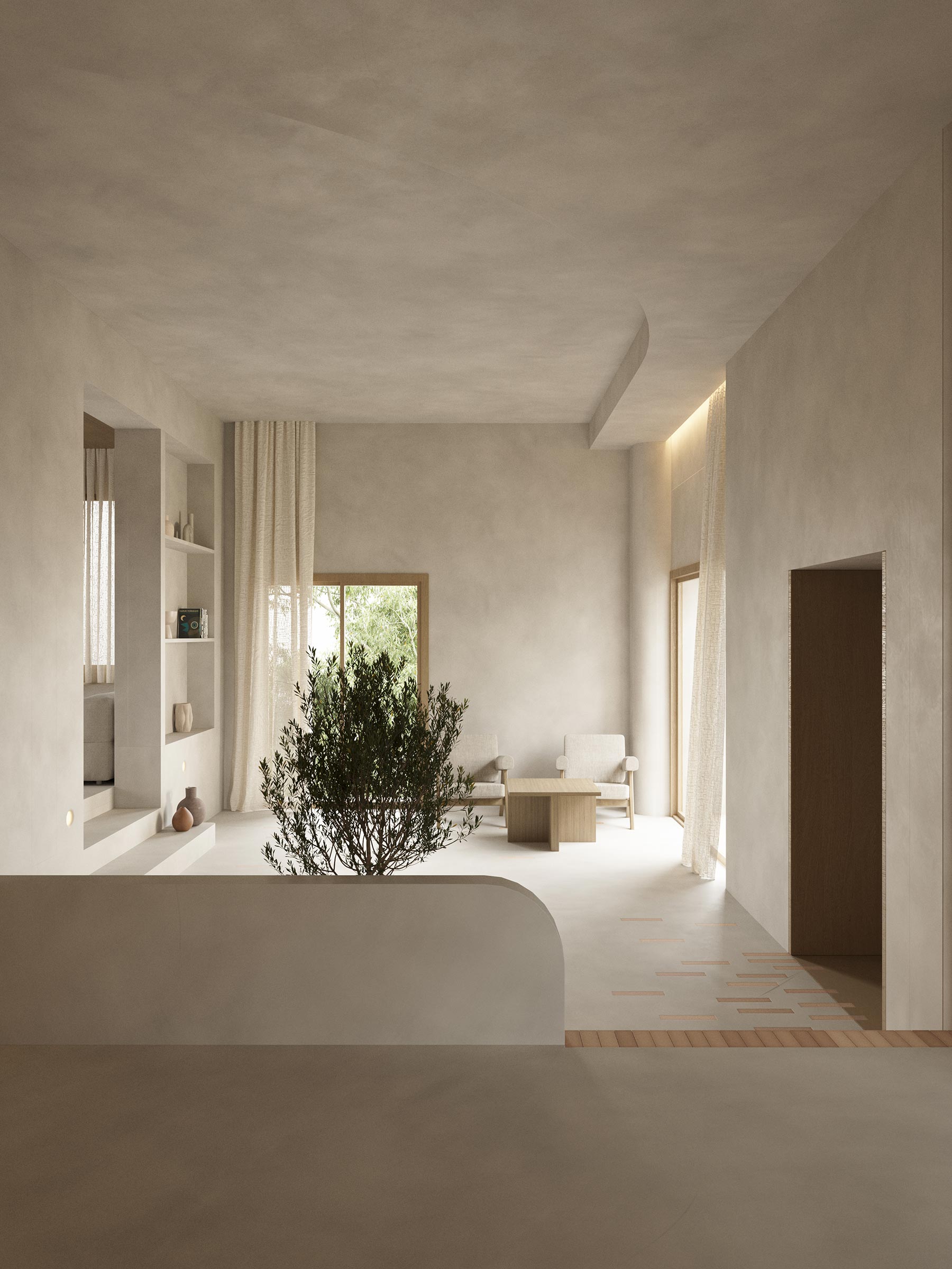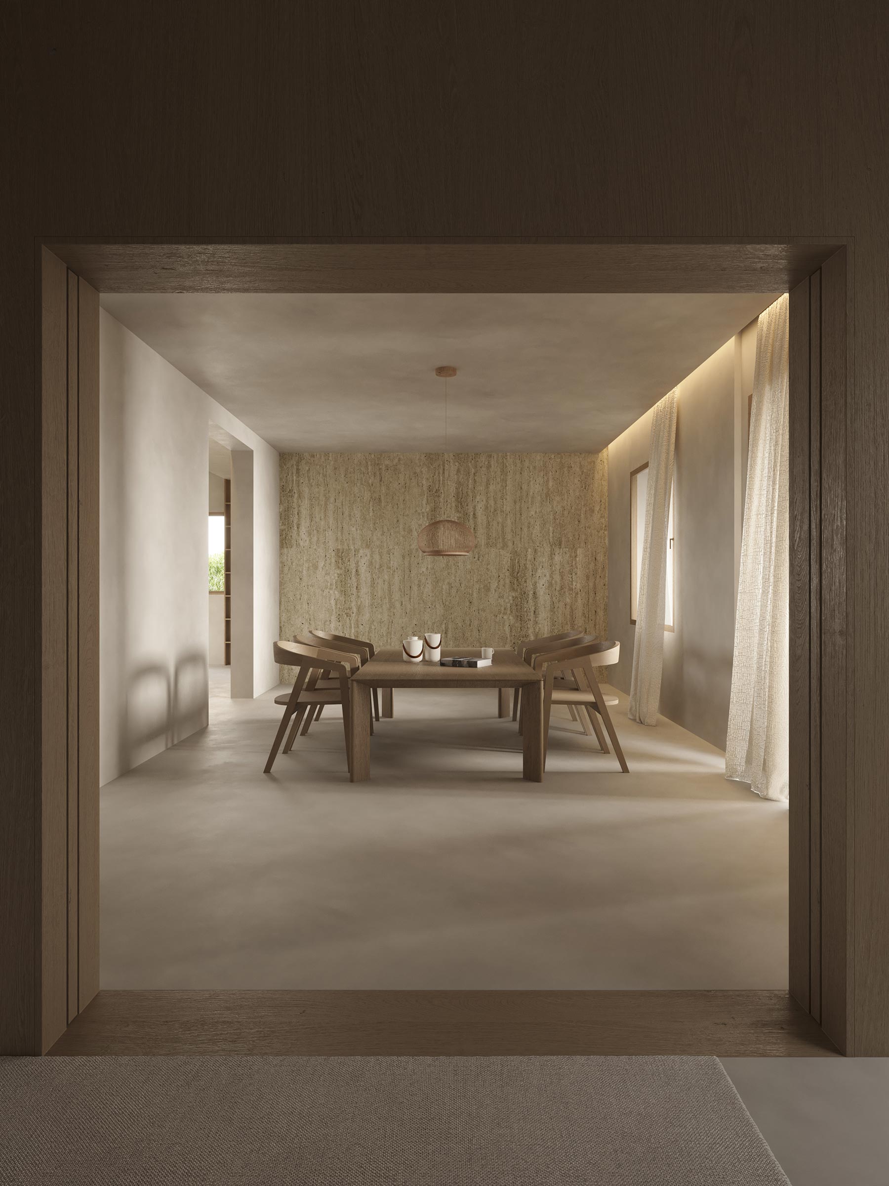 Se utilizan siempre materiales naturales de proximidad. Los elementos principales del proyecto son la madera de roble natural, el travertino, la terracota manual y el uso de un pavimento continuo.