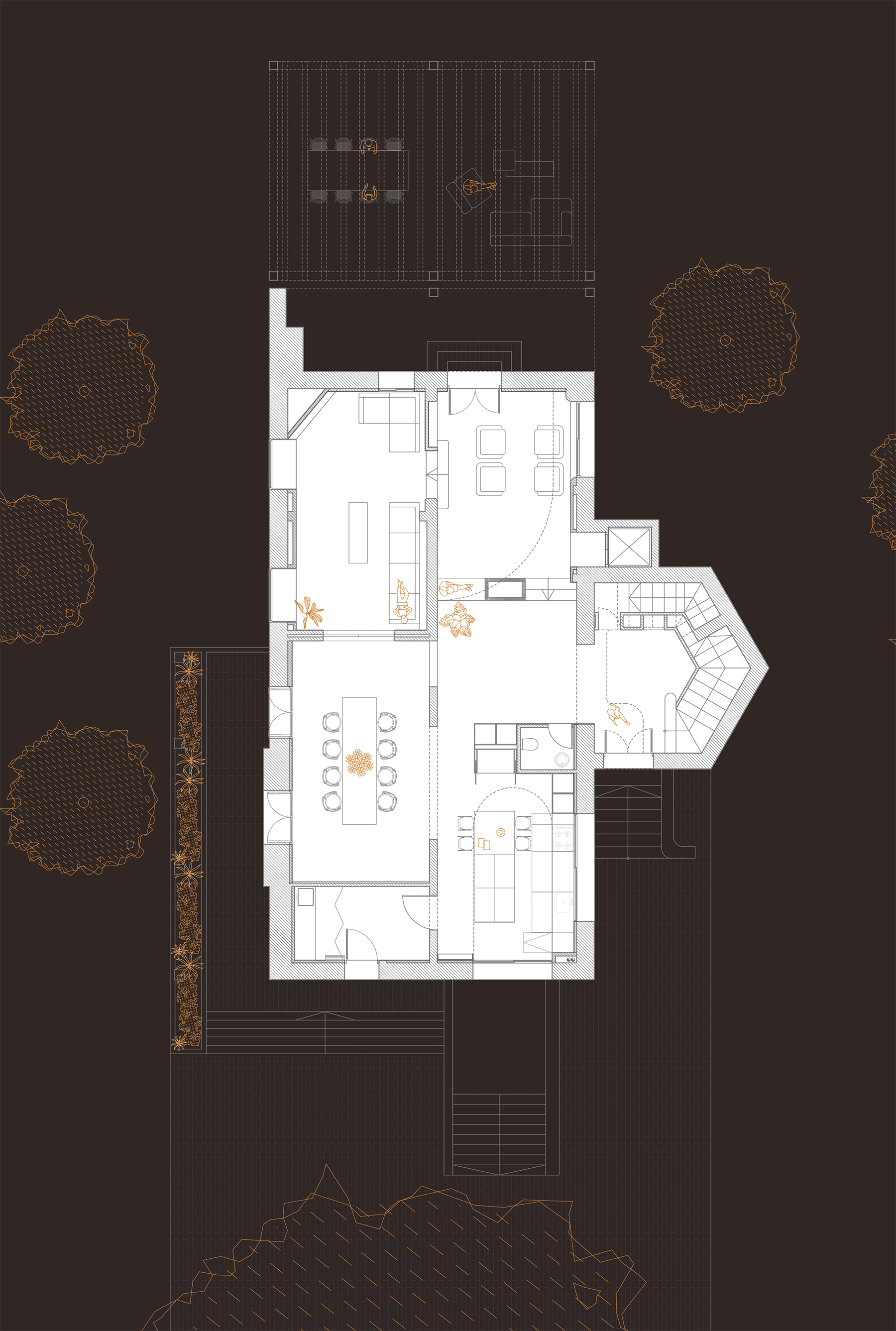 Además se unifica la planta baja, eliminando las habitaciones pequeñas y permitiendo que la zona de día se convierta en un espacio fluido y conectado pero manteniendo la posibilidad de separar mediante elementos flexibles y correderos las diferentes estancias. El diseño busca la sobriedad mediante el uso de pocos materiales que se repiten a lo largo de las estancias.