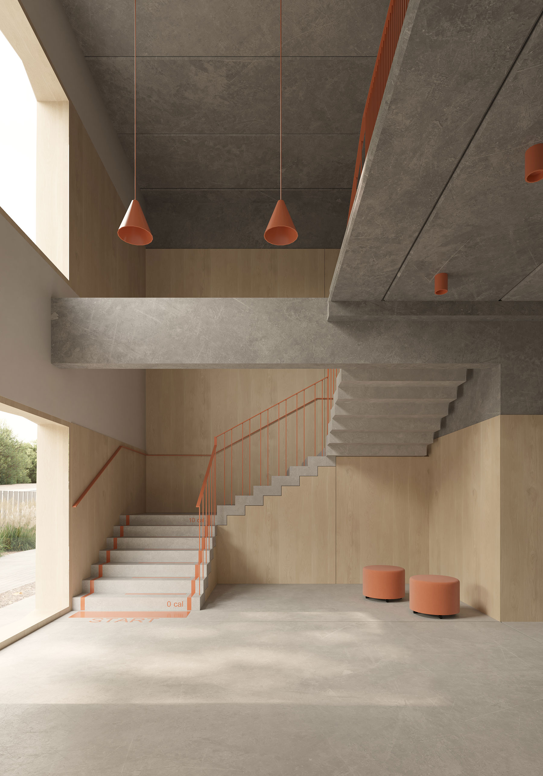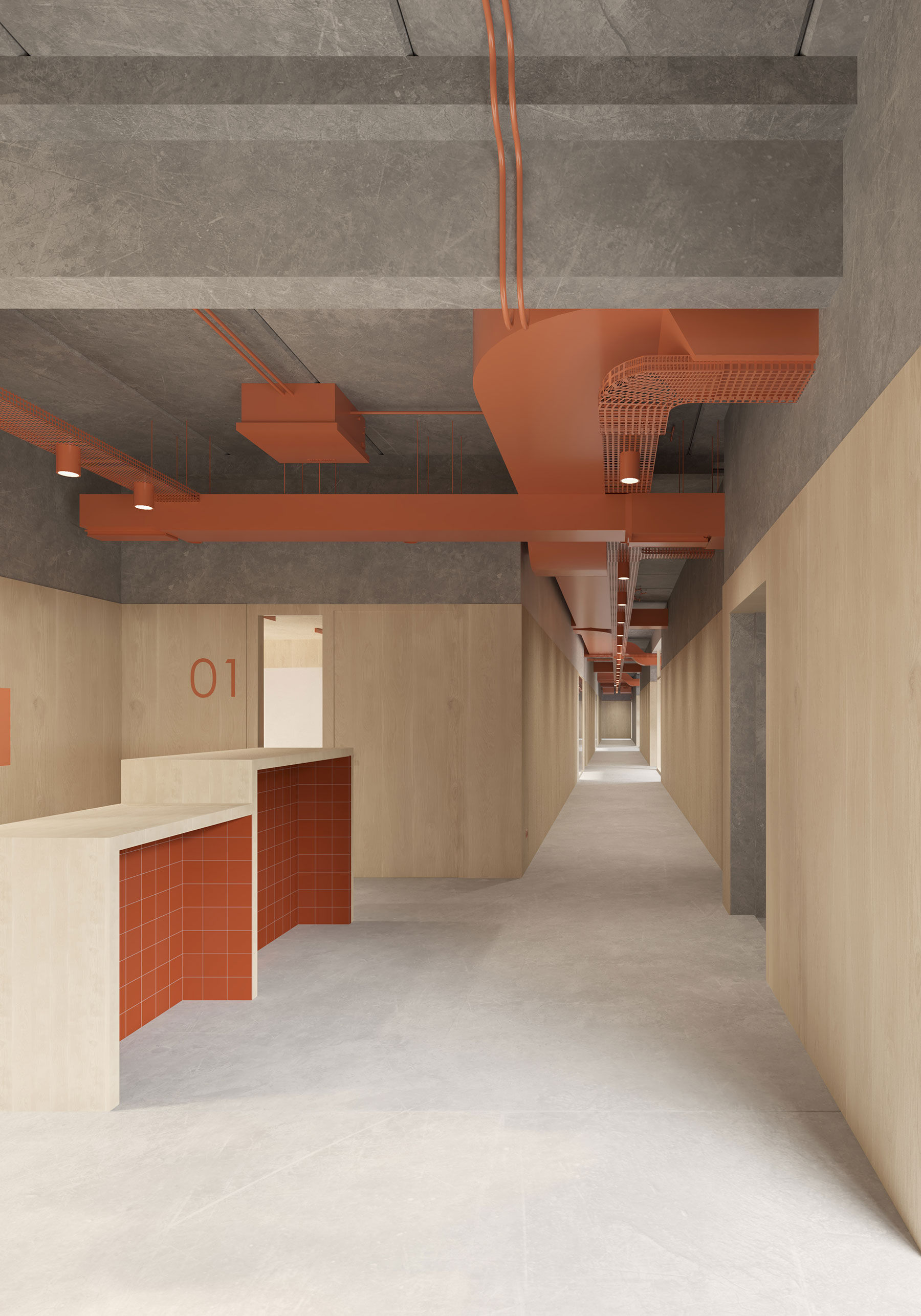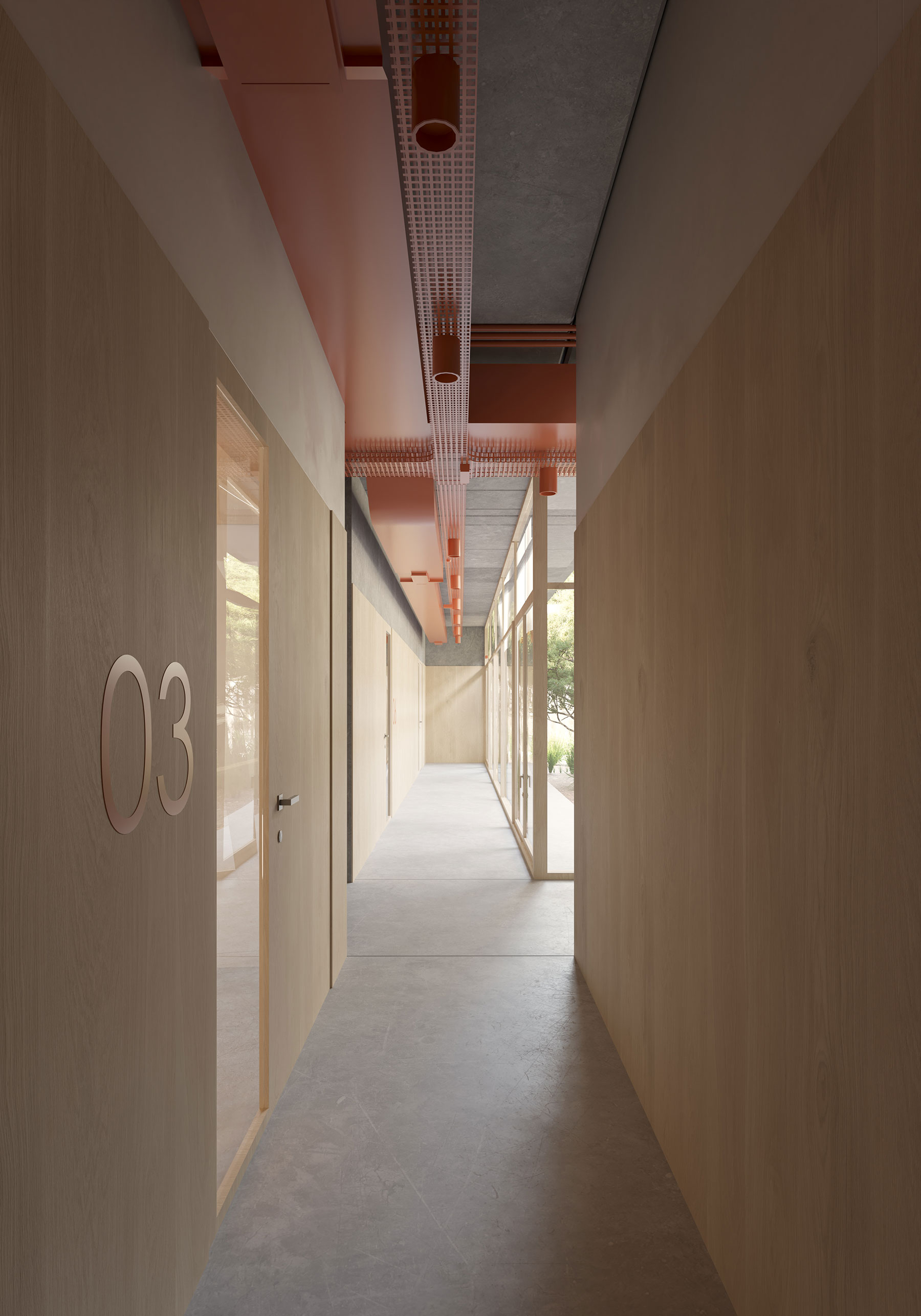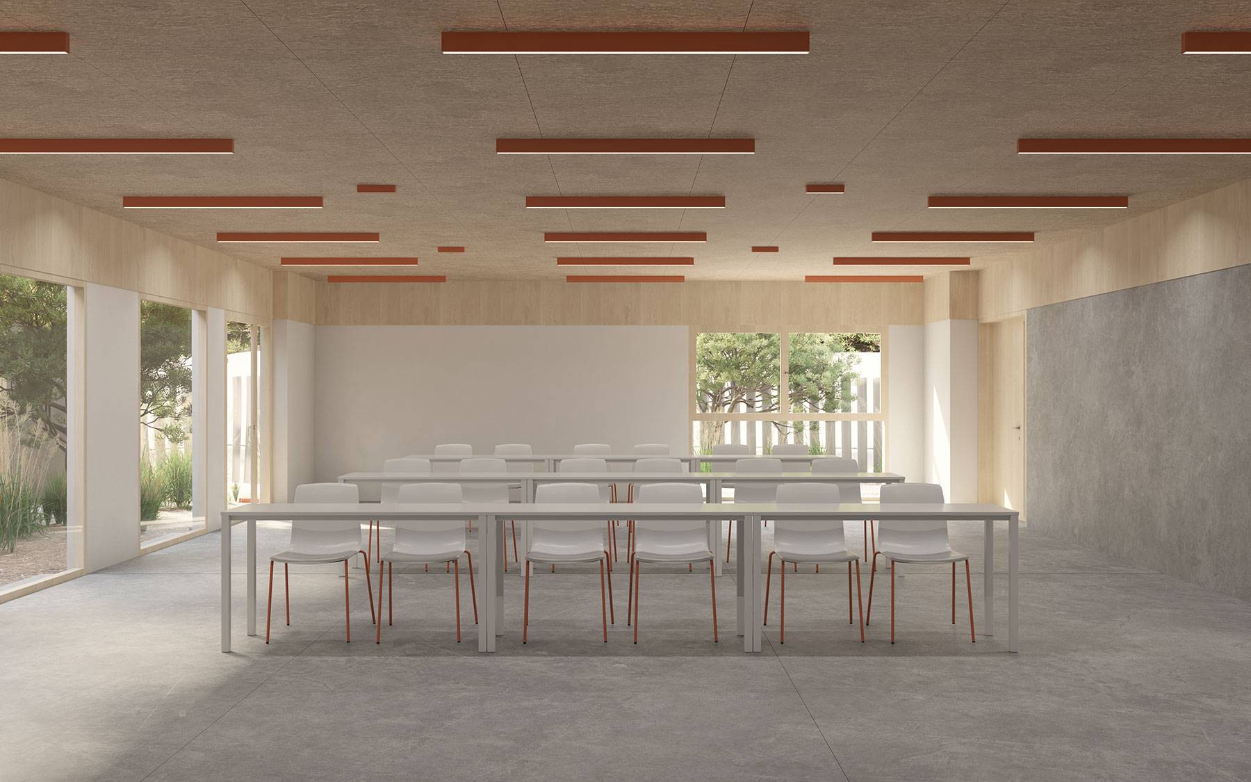 A la recepción y el hall de entrada se les dota de una doble altura, generando un espacio de mayor calidad arquitectónica y enfatizando el uso público al que está destinado. La mayor parte de las aulas, así como el taller, quedan orientados al noreste. La intención es orientarlas hacia la parcela destinada a zona verde, pretendiendo que en un futuro pueda convertirse en una extensión del centro, y pueda ser utilizada por los miembros del mismo.