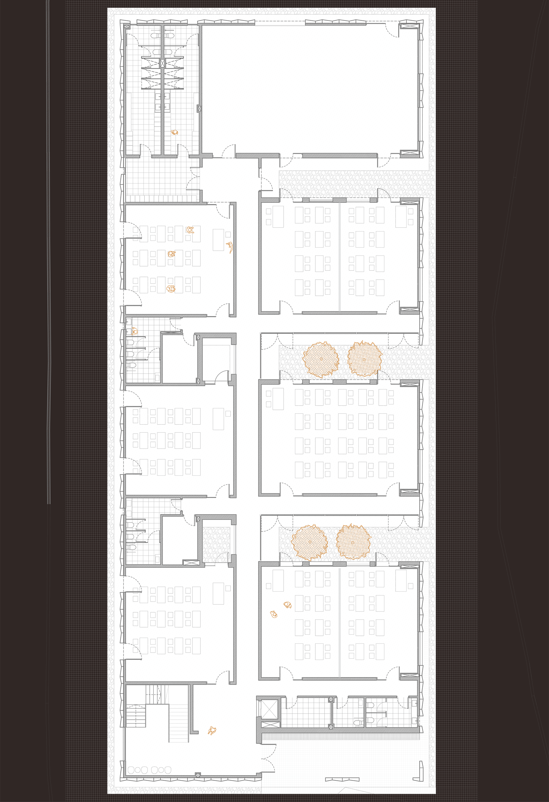Este sistema, genera un módulo compuesto por patio, aulas y áreas de servicio que se organiza mediante un pasillo central que recorre todo el edificio.