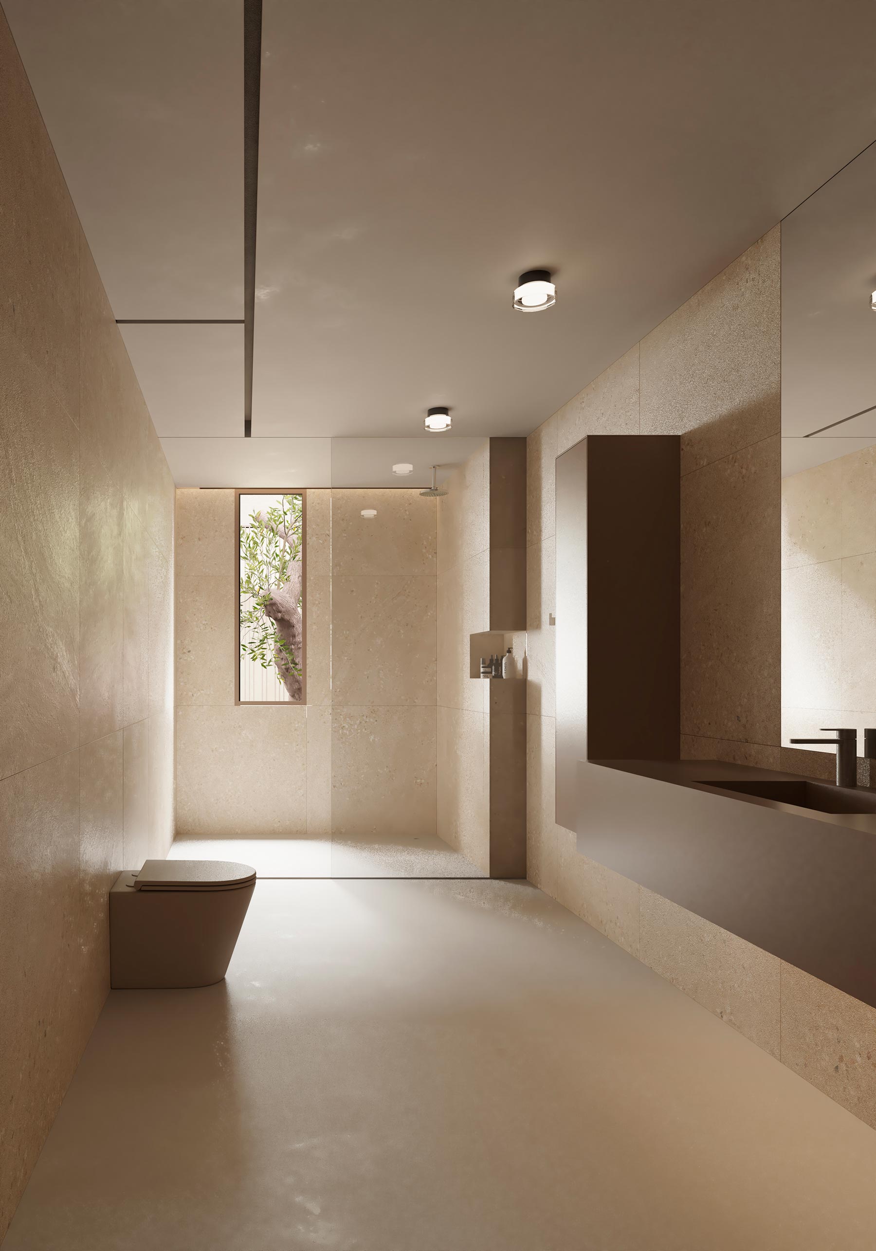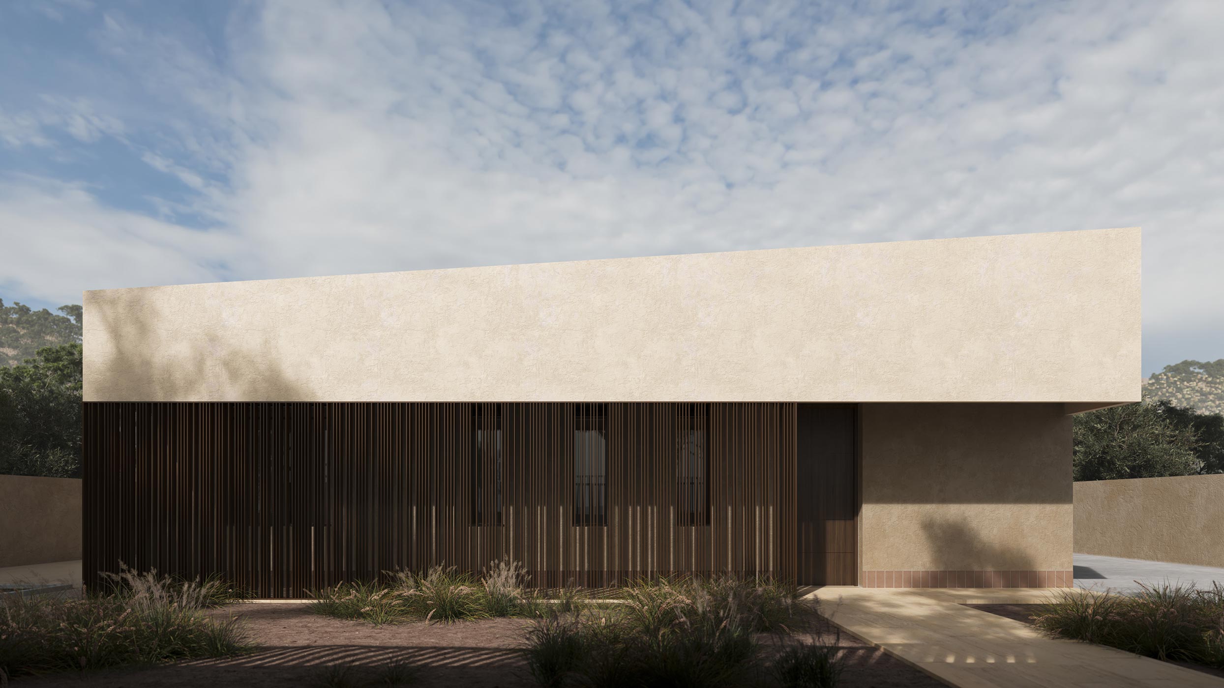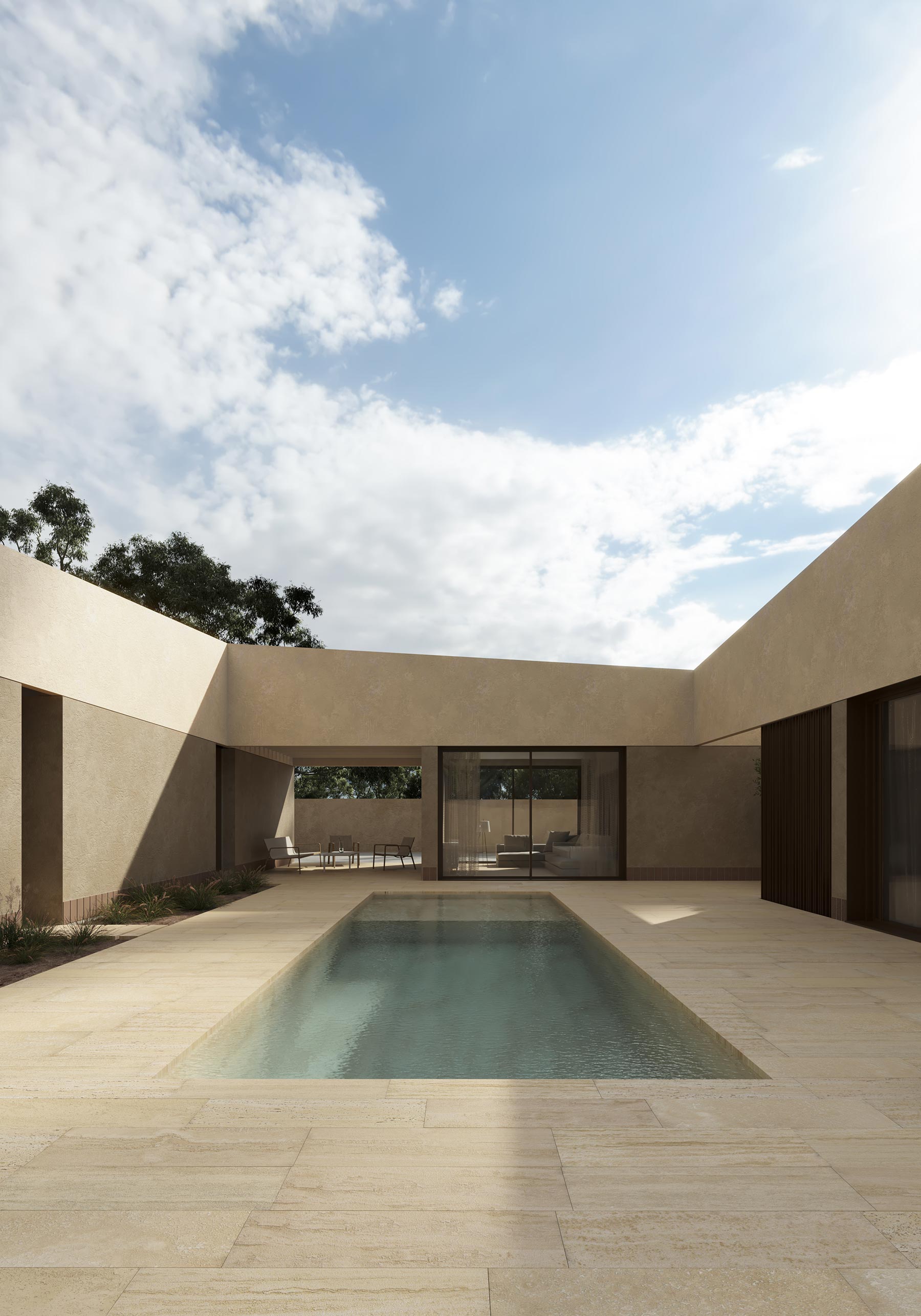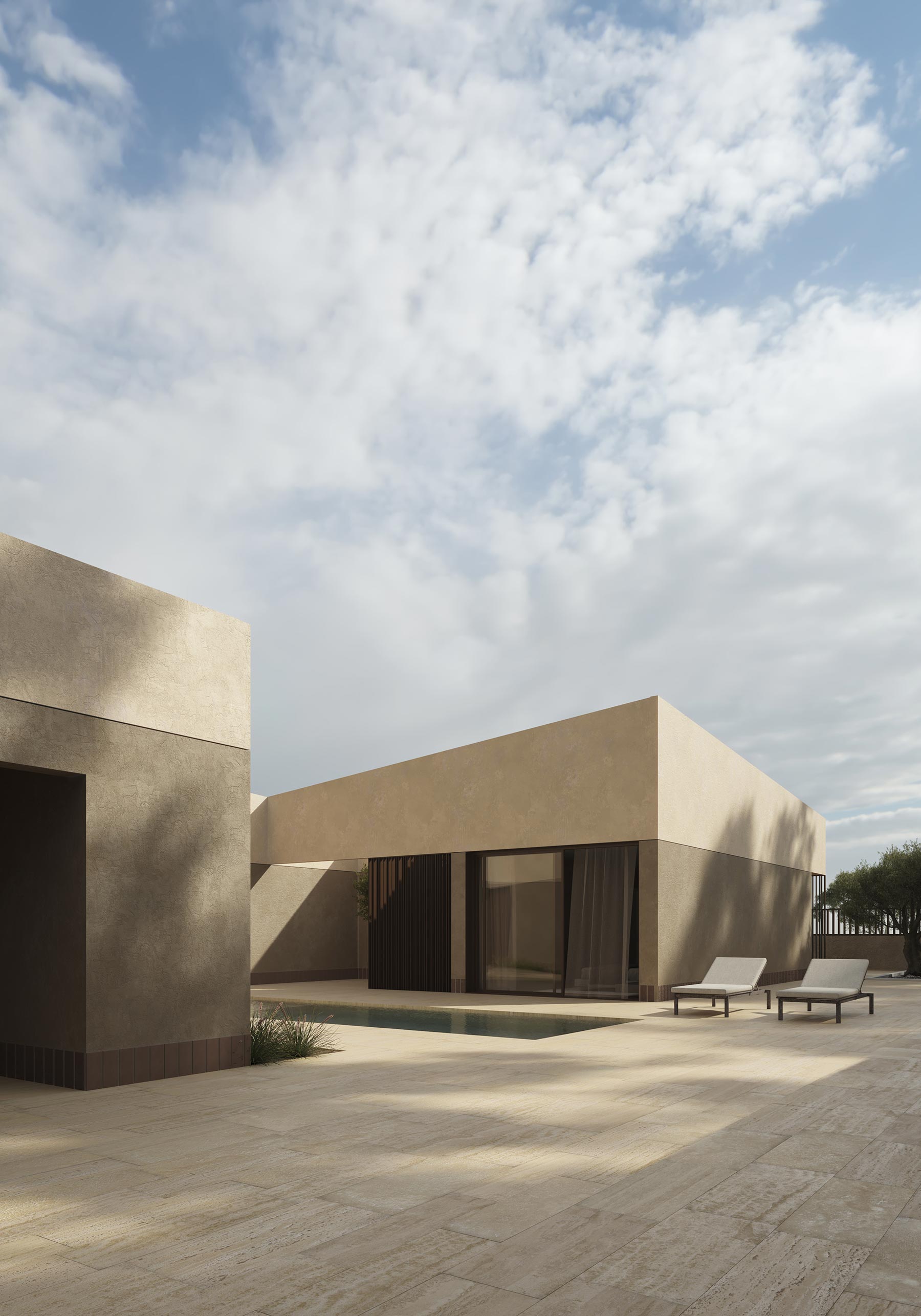 Con el fin de marcar los antepechos de la misma, se diferencian dos tonos en la fachada. El tono más oscuro se utiliza para la parte baja de la casa, la más relacionada con el terreno. Además, estos antepechos se diseñan de forma que en vez de ser planos, generan pendientes en fachada, simulando las montañas de las que se rodea la casa, permitiendo generar una imagen identificativa. El pavimento exterior, se proyecta de travertino natural, al igual que el revestimiento de la piscina.