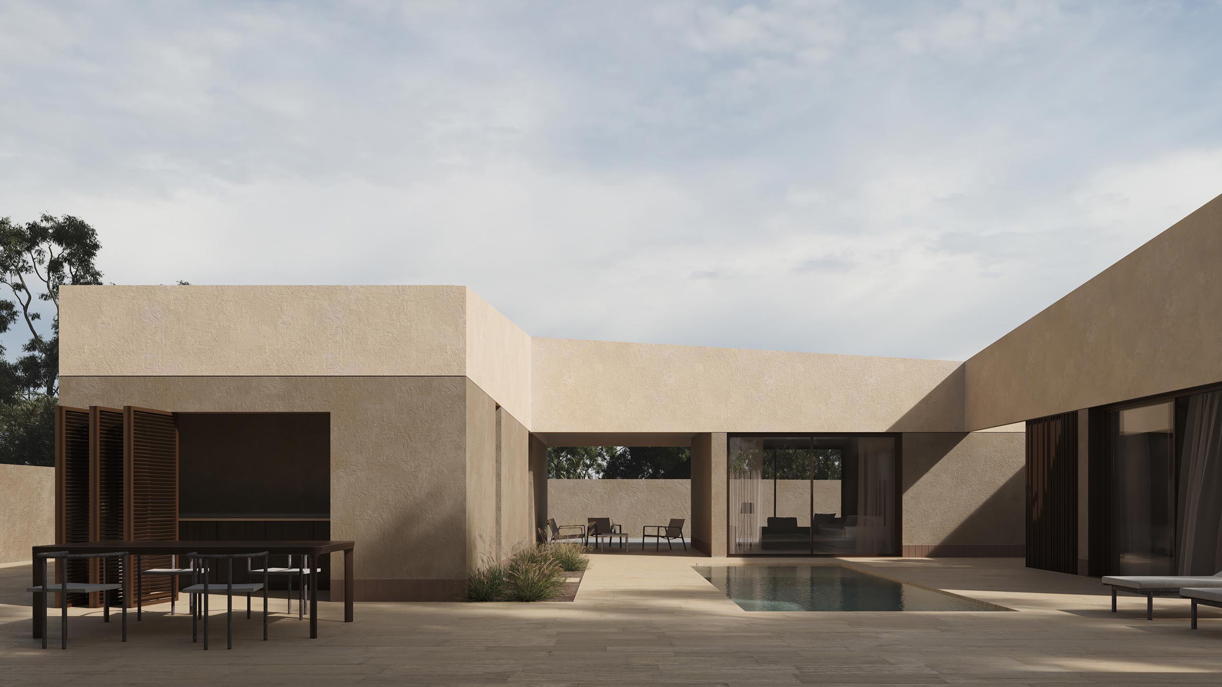 Los usos de la vivienda se configuran mediante dos módulos diferenciados unidos mediante una terraza cubierta. El módulo principal agrupa los usos propios de la vivienda a través de una distribución en forma de L, que se configura alrededor de un patio interior donde se encuentran las zonas comunes exteriores y la piscina. Cerrando este patio interior, se dispone el segundo módulo, que alberga los espacios para invitados y una barbacoa exterior.