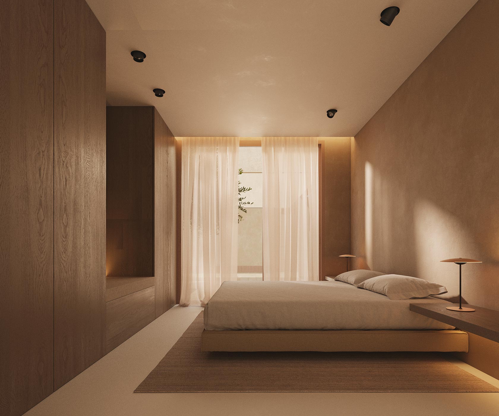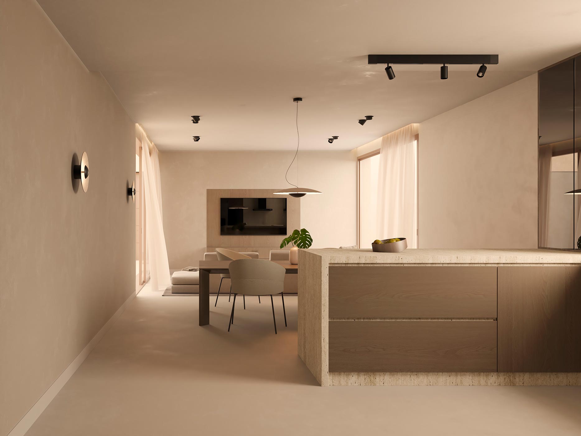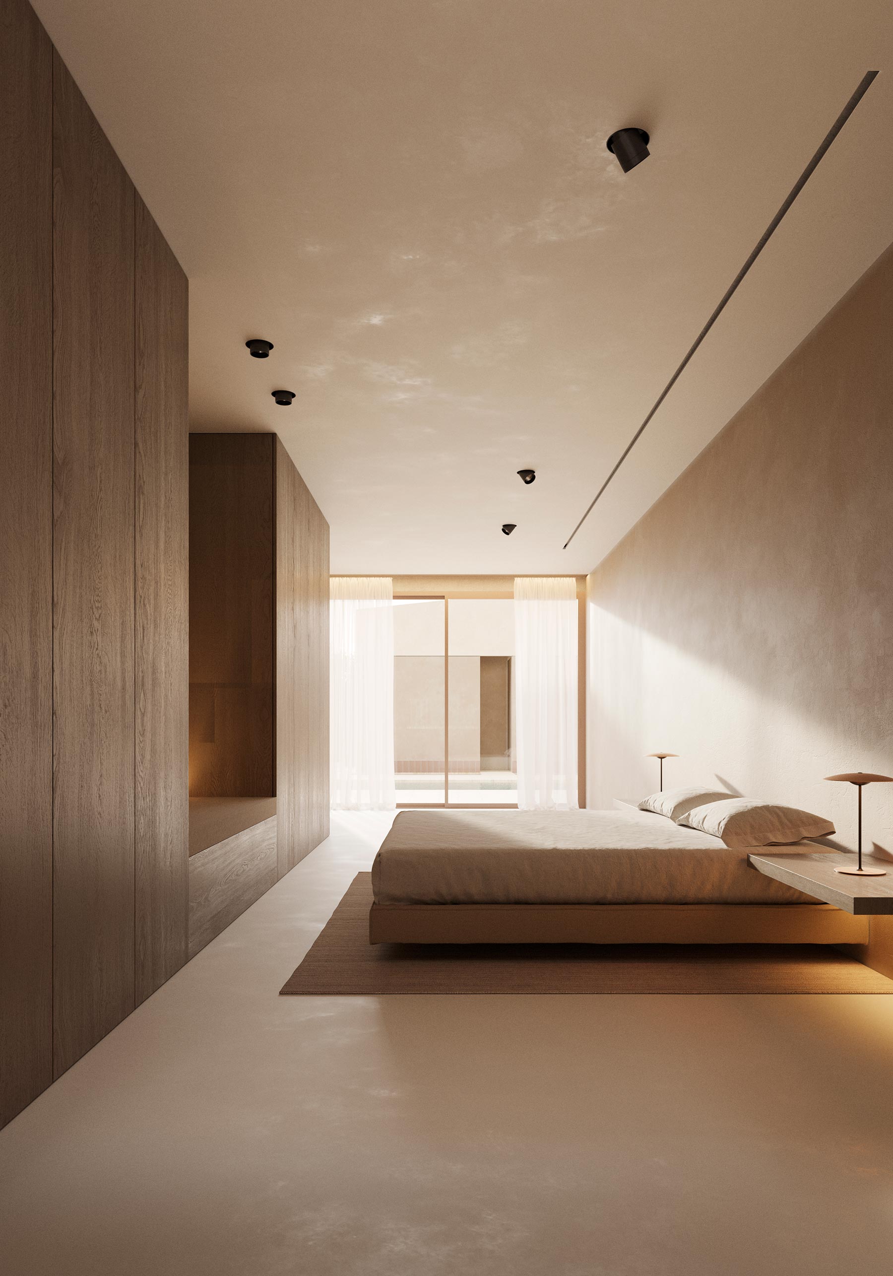 La materialidad en el interior de la vivienda hace referencia a los materiales existentes en el exterior. El suelo, se plantea como un pavimento continuo en color beige, con tonos similares al travertino. El pavimento continuo responde directamente a las necesidades de accesibilidad de la vivienda, permitiendo eliminar la existencia de juntas y resaltes en toda la superficie de la vivienda. En todo el interior de la vivienda se utiliza madera de roble natural y revestimientos de travertino.