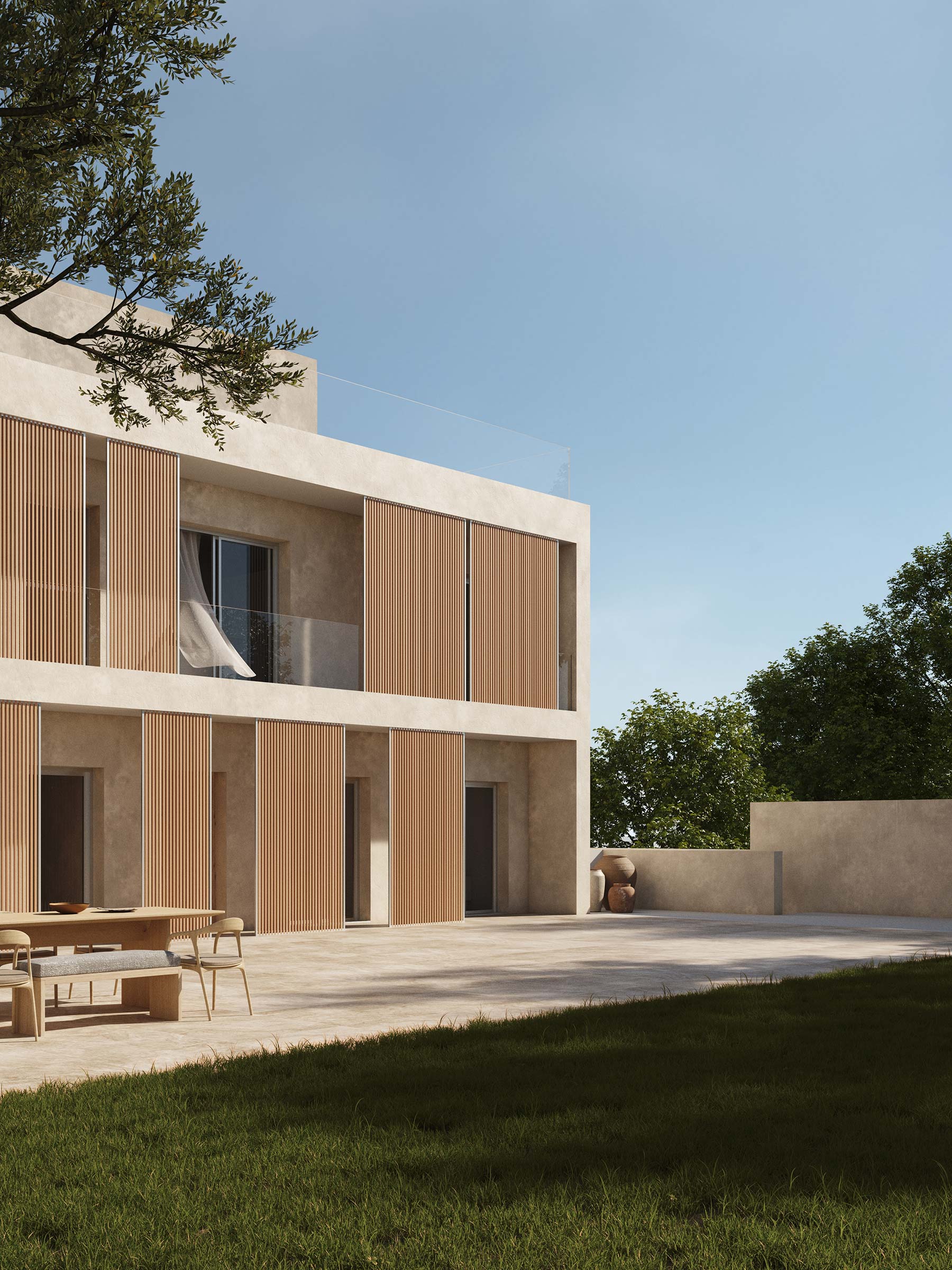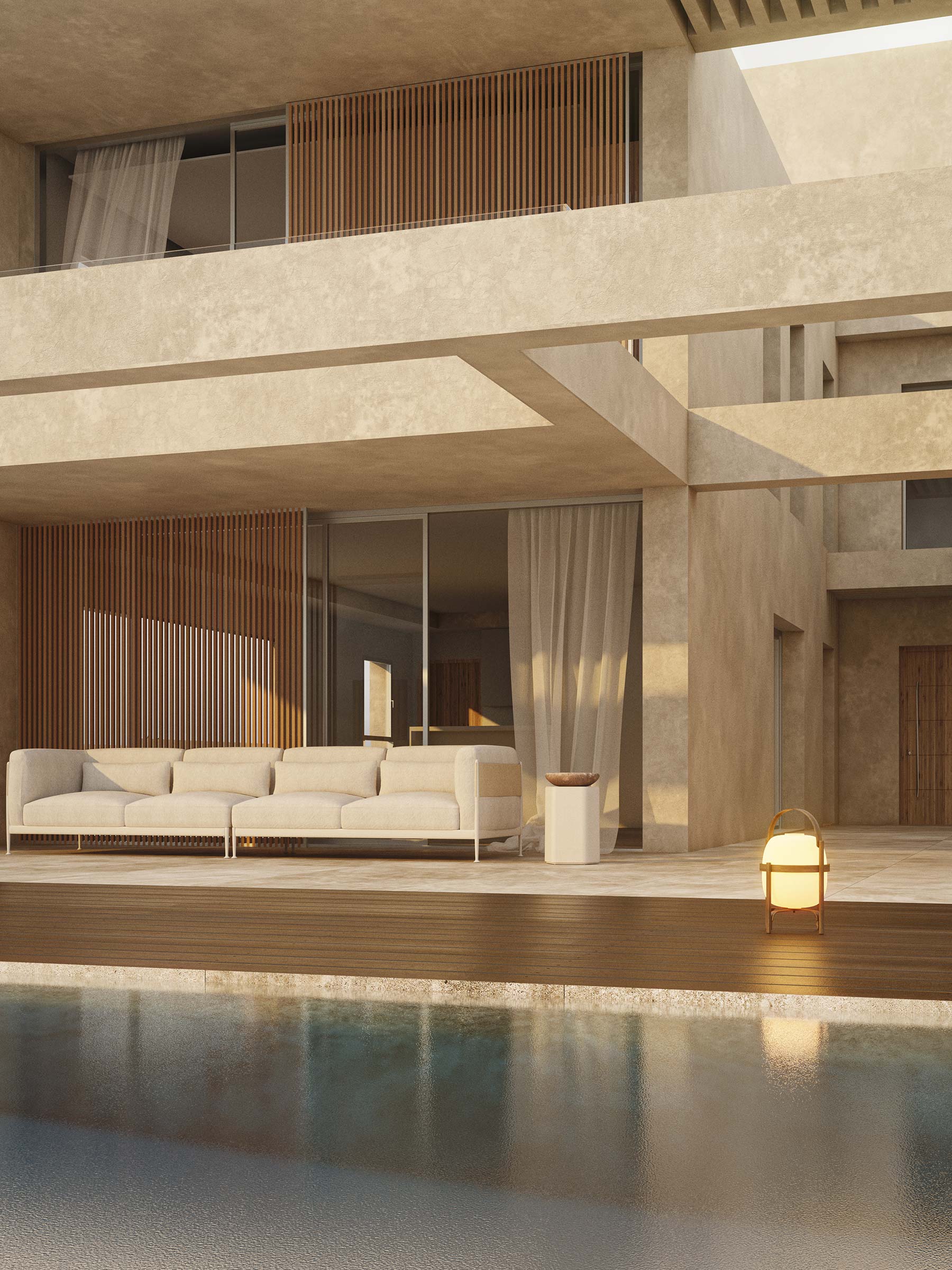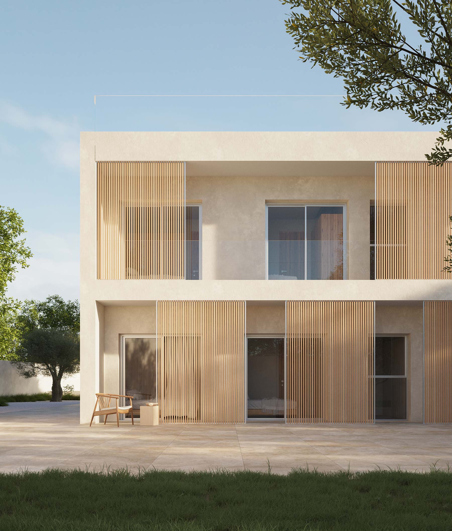 La conexión entre los diversos bloques se establece mediante las zonas de servicio, manteniendo así la privacidad de las áreas más íntimas de cada módulo. Además, se incorporan celosías correderas que permiten la separación de las áreas exteriores, generando terrazas privadas individuales, pero al mismo tiempo ofreciendo la posibilidad de unificar el espacio al aire libre cuando sea necesario.