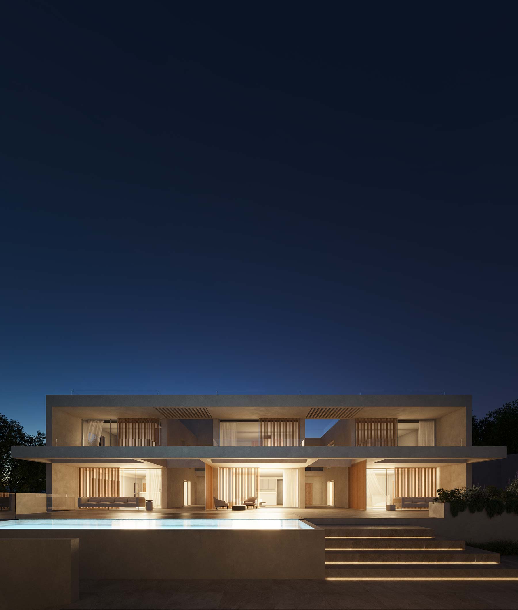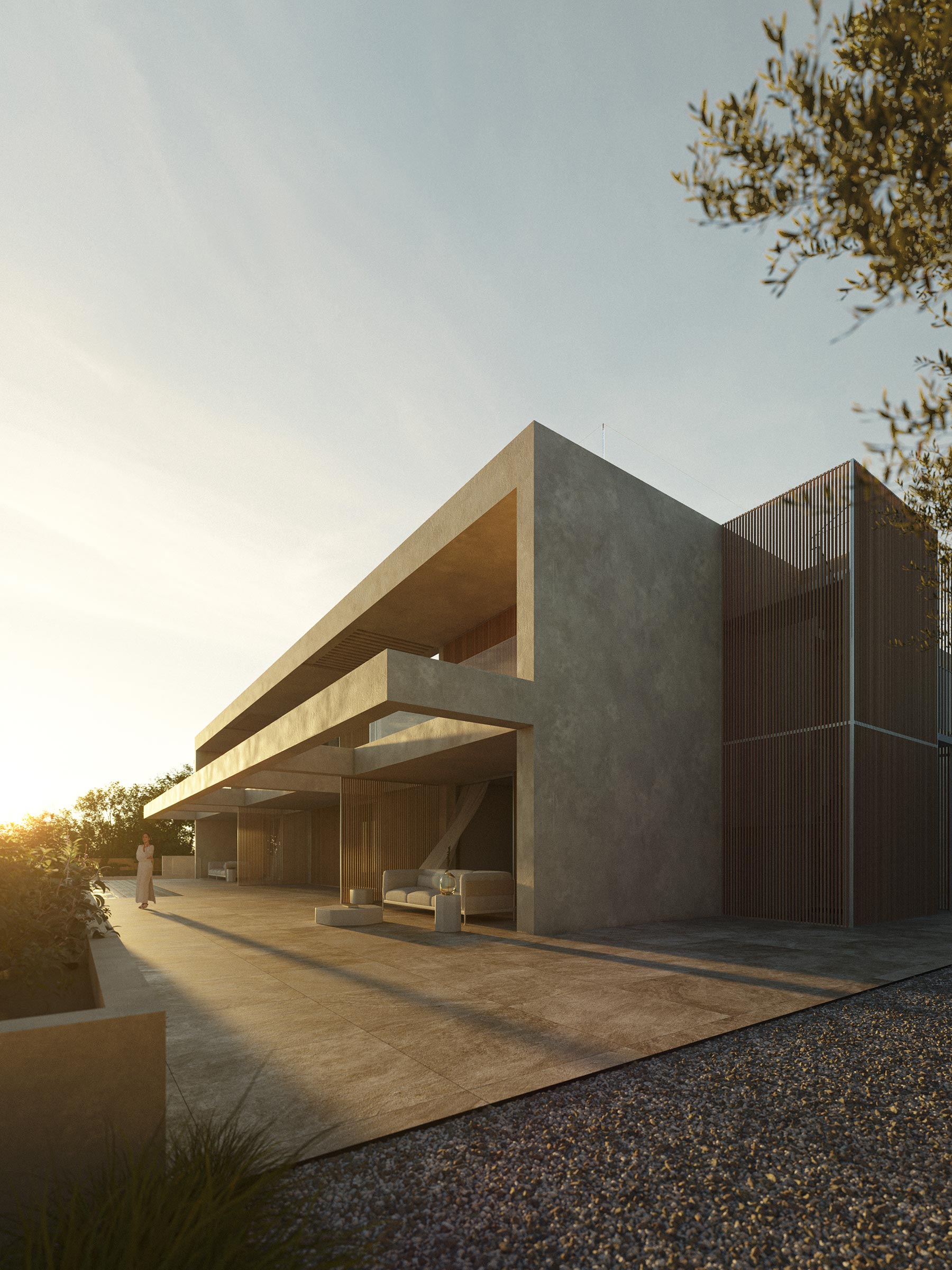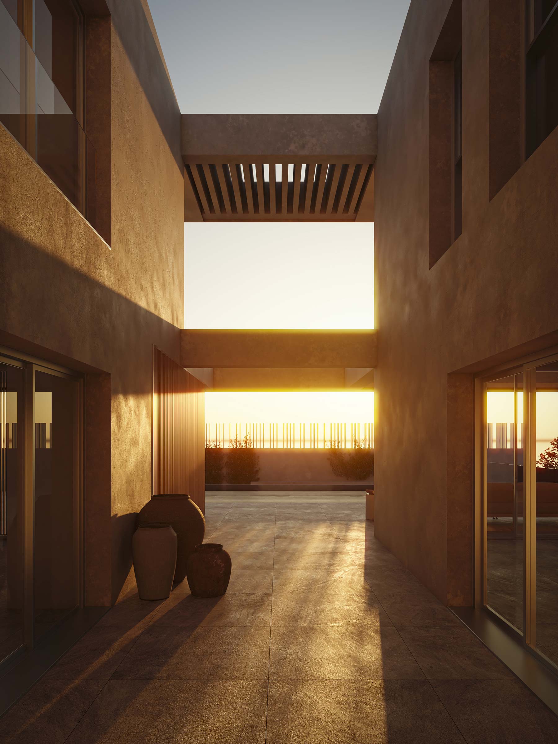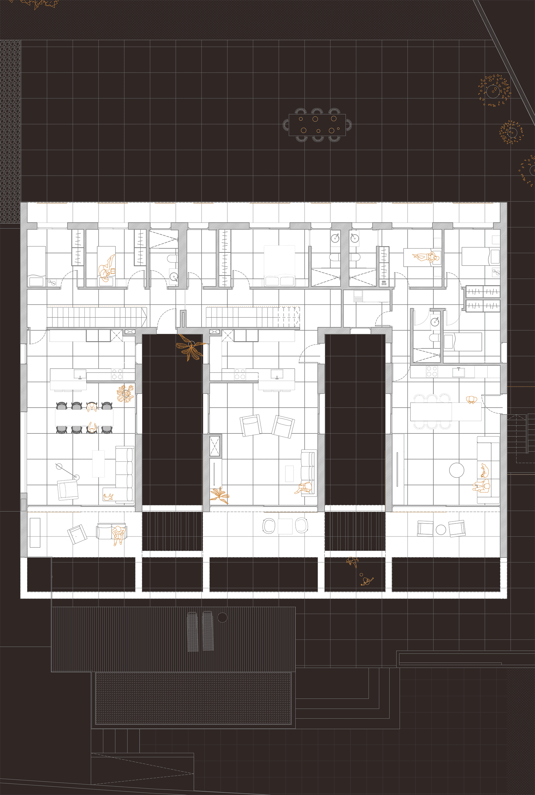 La conexión entre los diversos bloques se establece mediante las zonas de servicio, manteniendo así la privacidad de las áreas más íntimas de cada módulo. Además, se incorporan celosías correderas que permiten la separación de las áreas exteriores, generando terrazas privadas individuales, pero al mismo tiempo ofreciendo la posibilidad de unificar el espacio al aire libre cuando sea necesario.